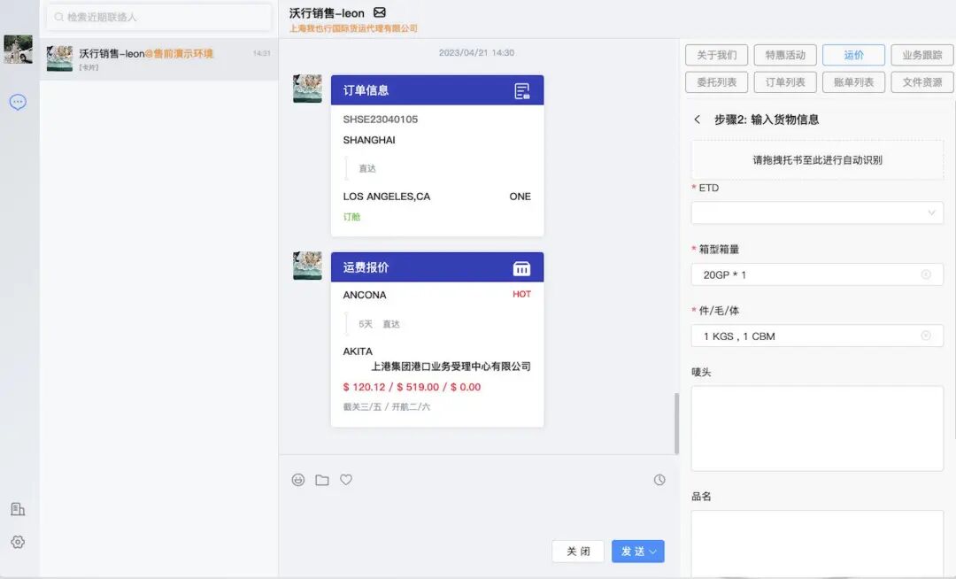 客户使用个人微信/qq,或者进入沃行通,就能和货代聊天,询价、下单。