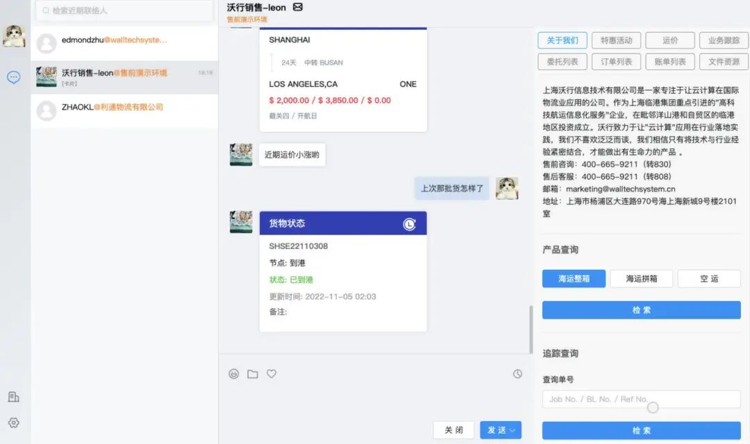 在沃行通,客户和货代都能看到一个即时通讯的沟通窗口和系统工具面板——可选丰富的业务智能工具。